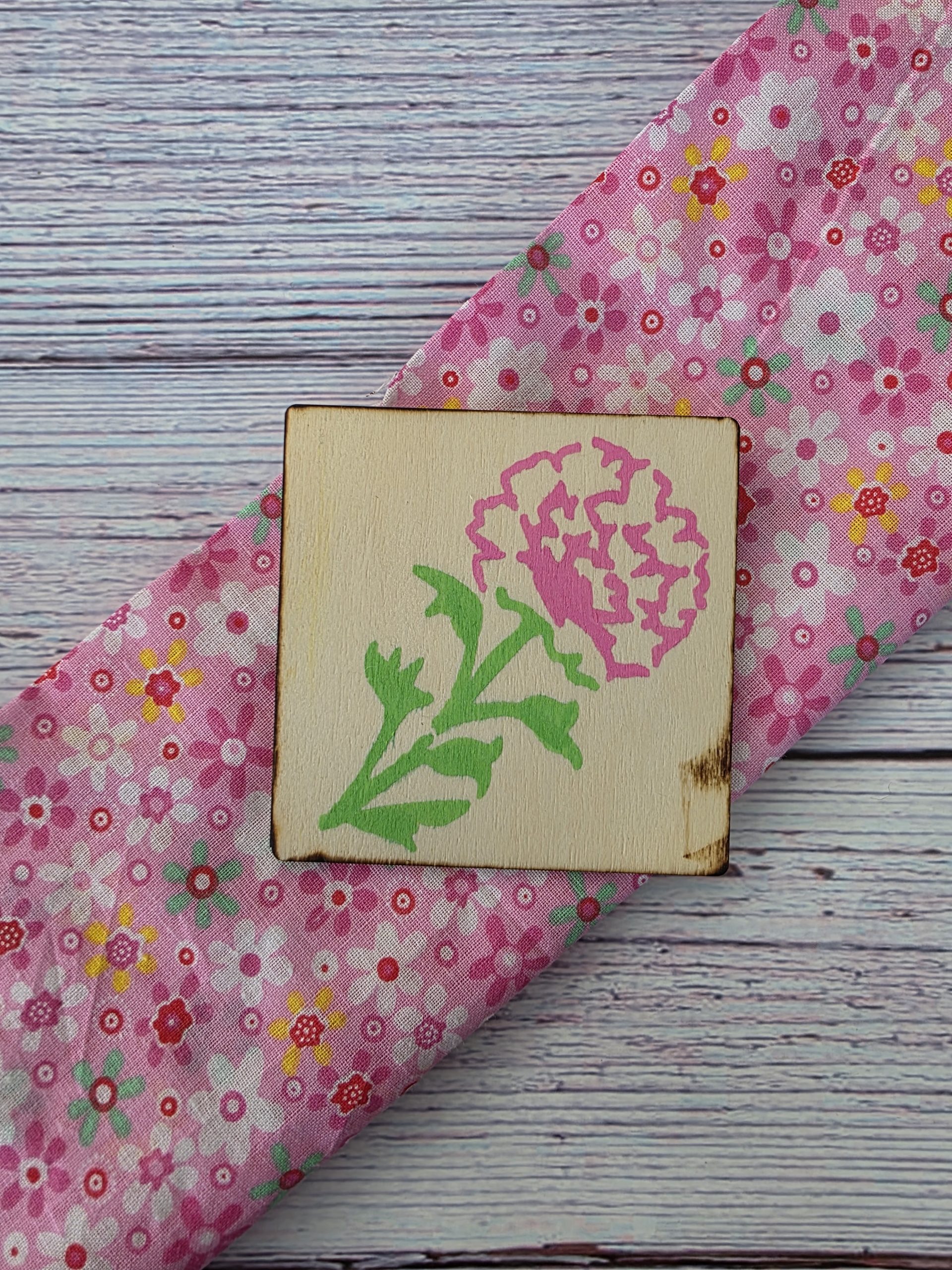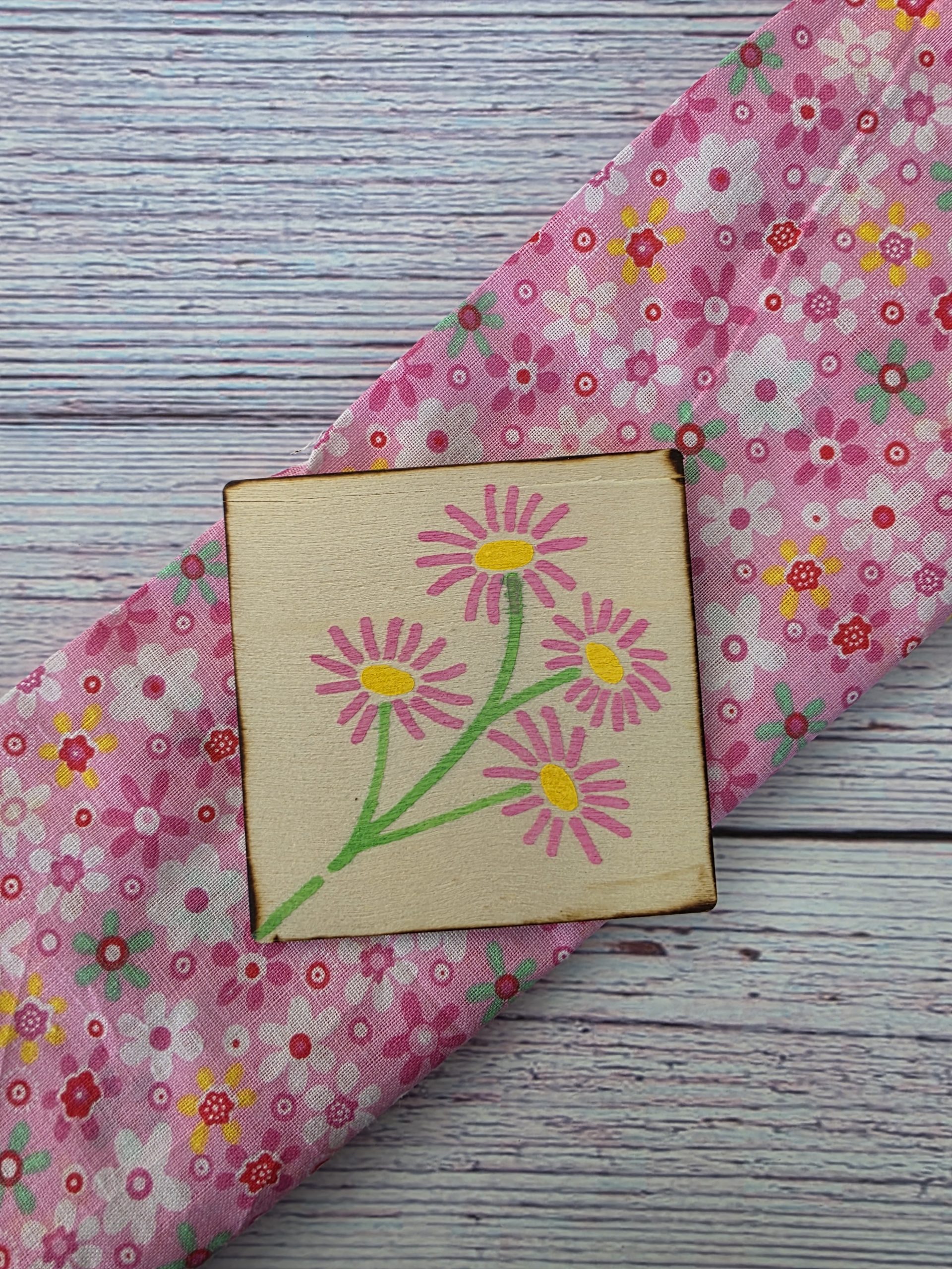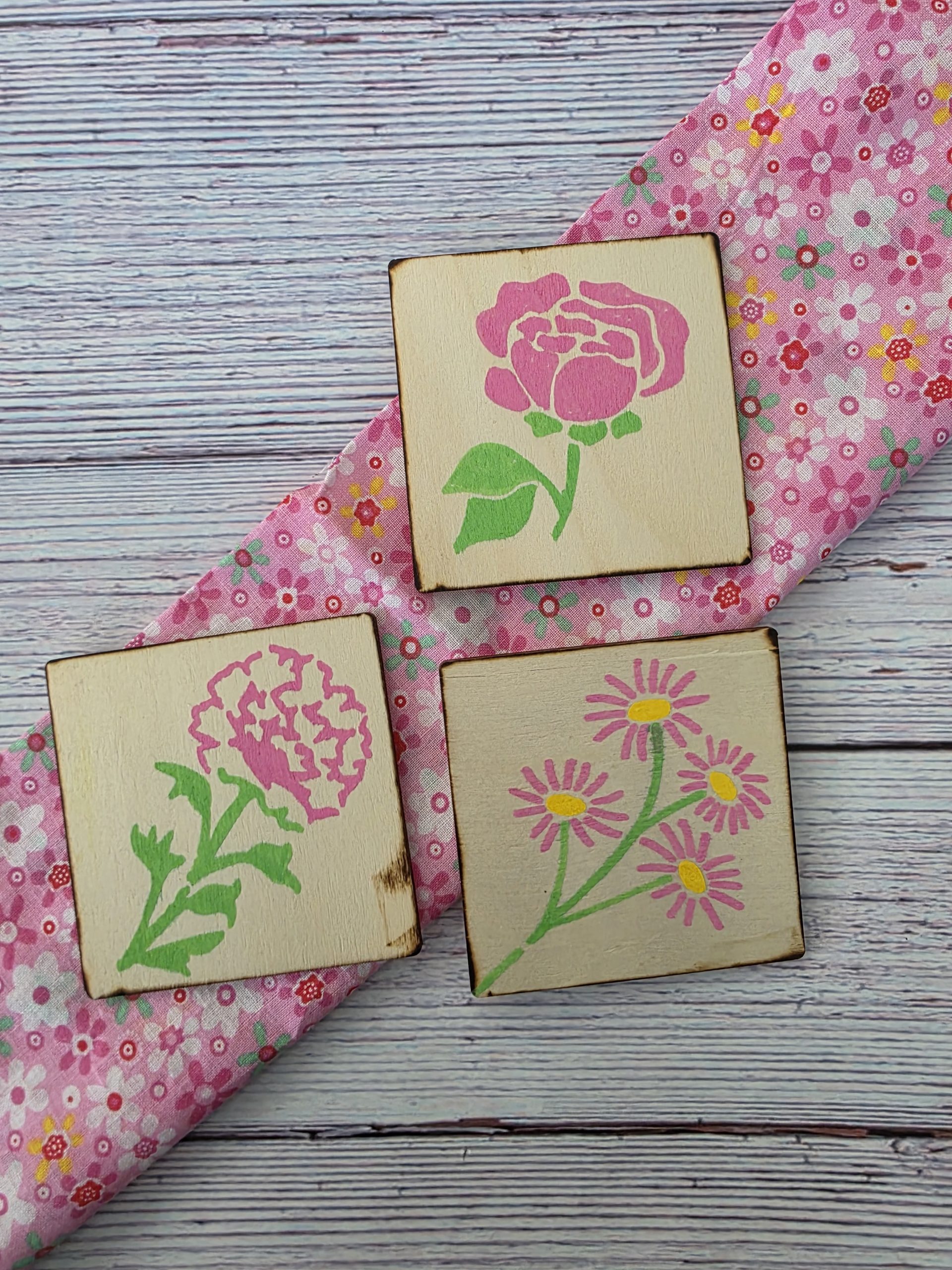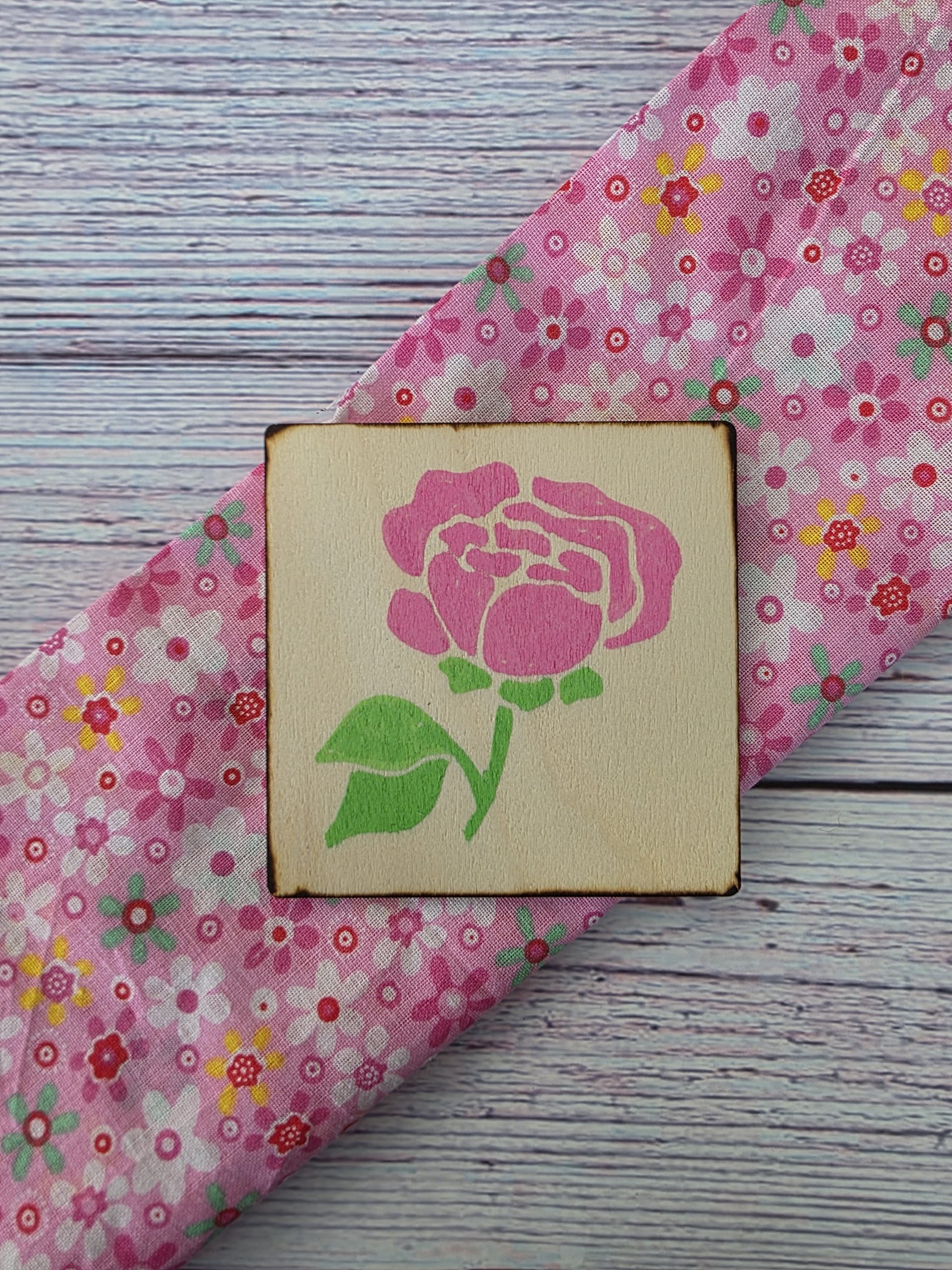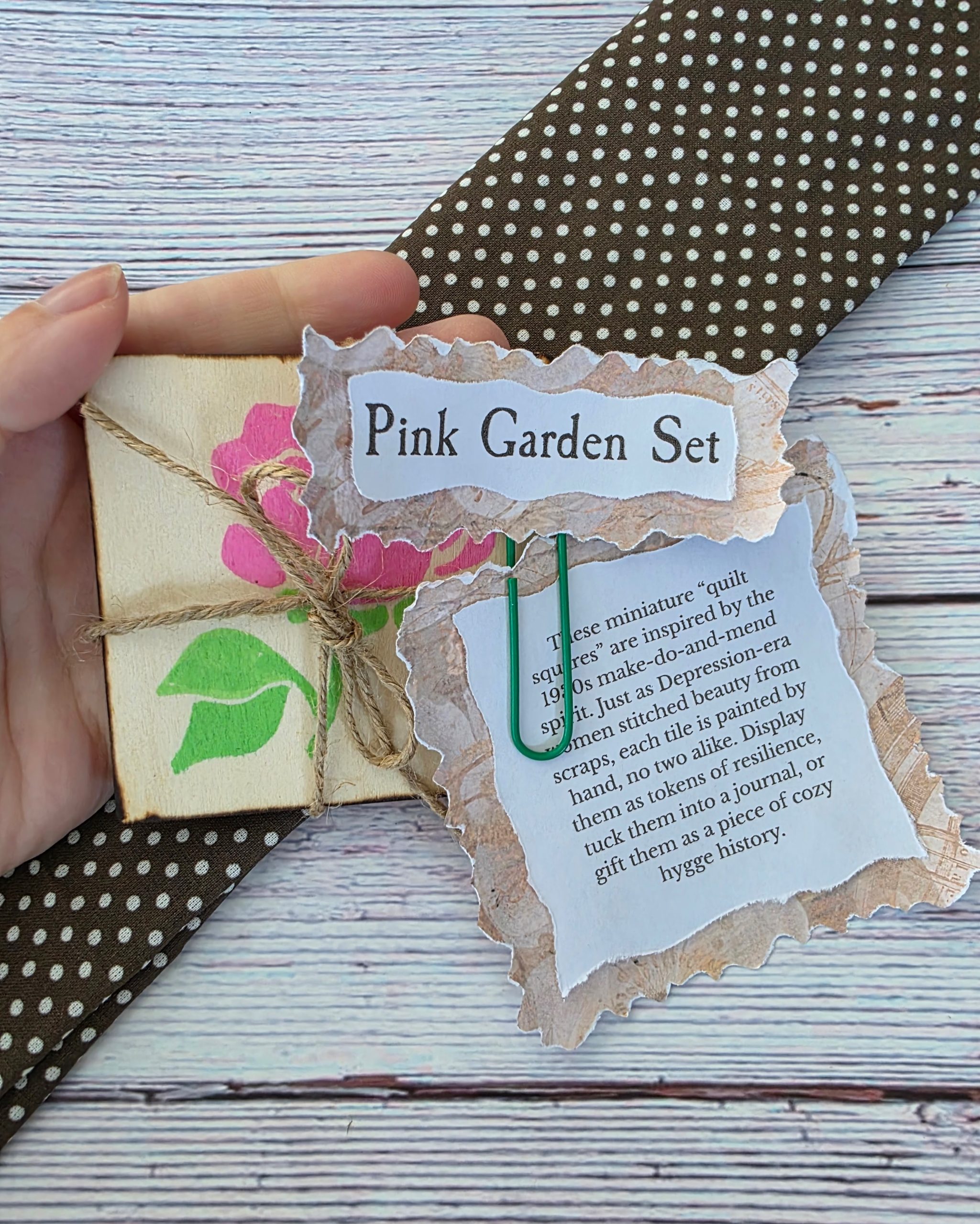 Set of hand-painted wooden quilt tiles inspired by pink garden florals, tied with twine and paired with a story card. A small artisan keepsake rooted in 1930s make-do-and-mend tradition.