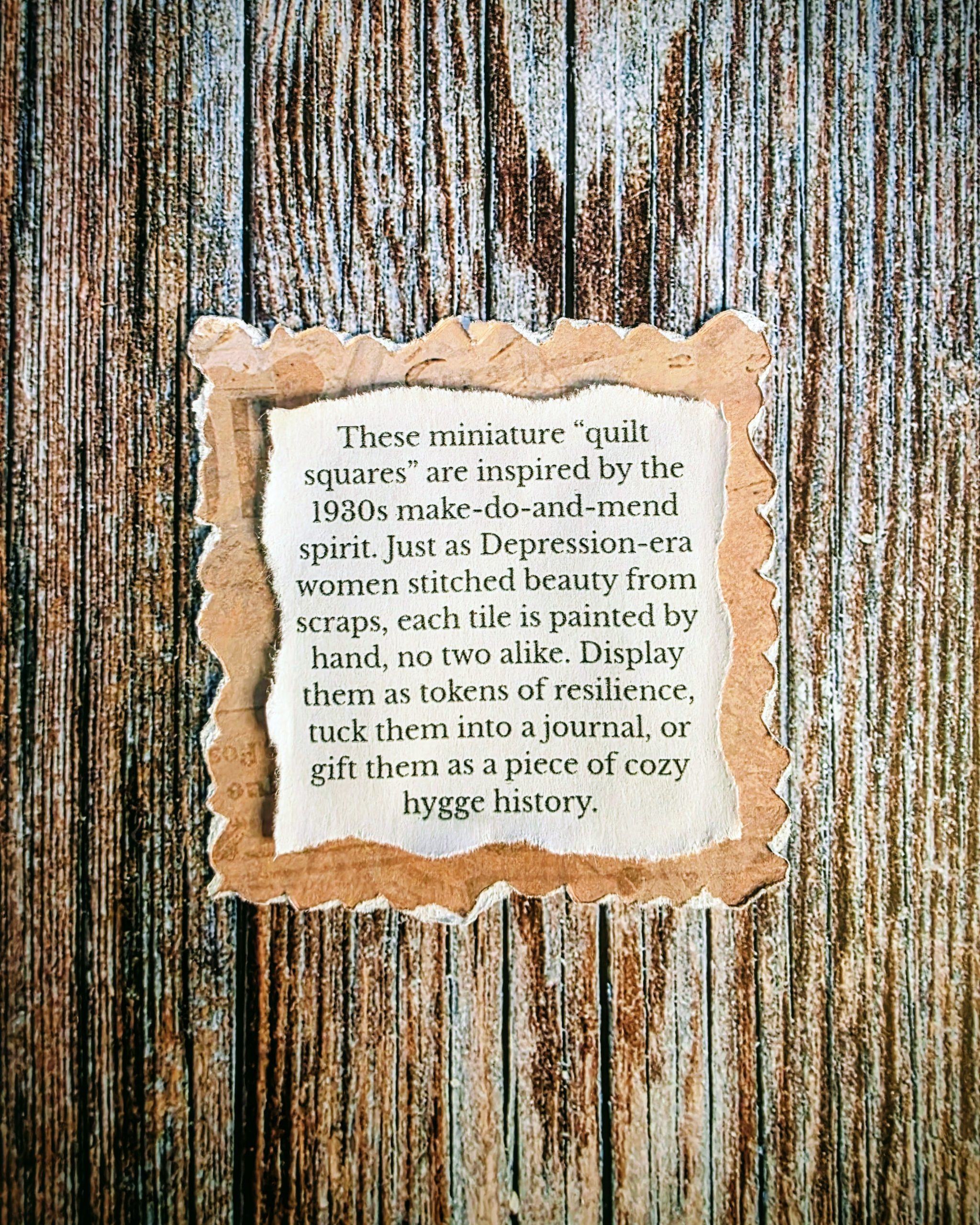 Designed as decorative miniatures rather than functional tiles, these quilt squares can be displayed on a shelf, tucked into a journal, used as seasonal décor, or gifted as a small piece of cozy, history-inspired art.