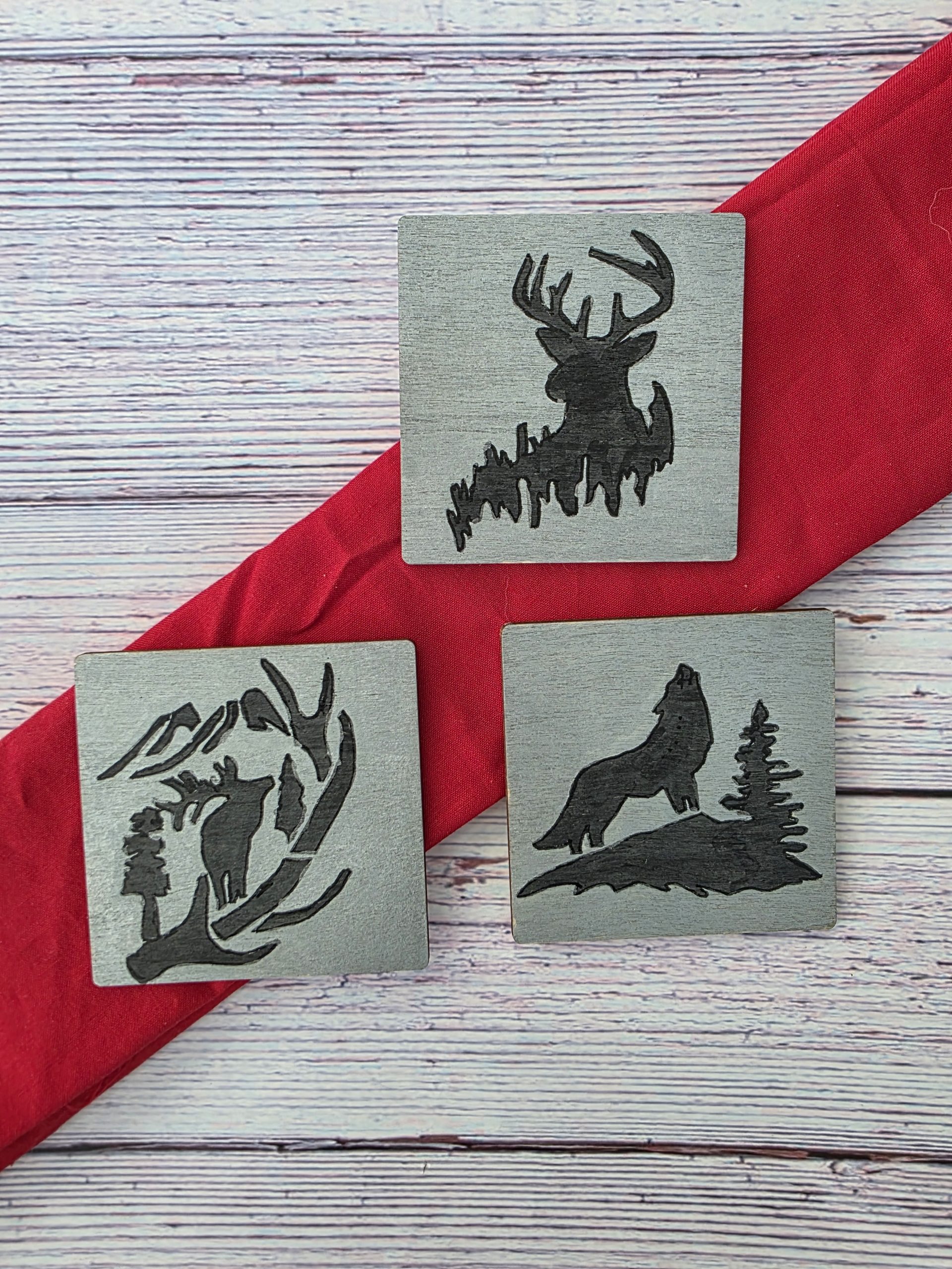 Set of hand-painted wooden quilt tiles inspired by muted woodland silhouettes and silver-gray tones, tied with twine and paired with a story card. A small artisan keepsake rooted in 1930s make-do-and-mend tradition.