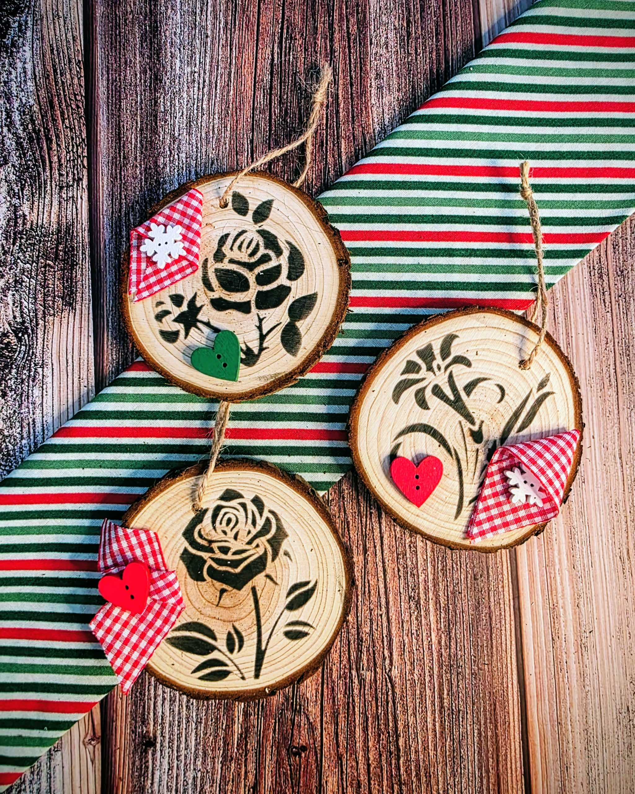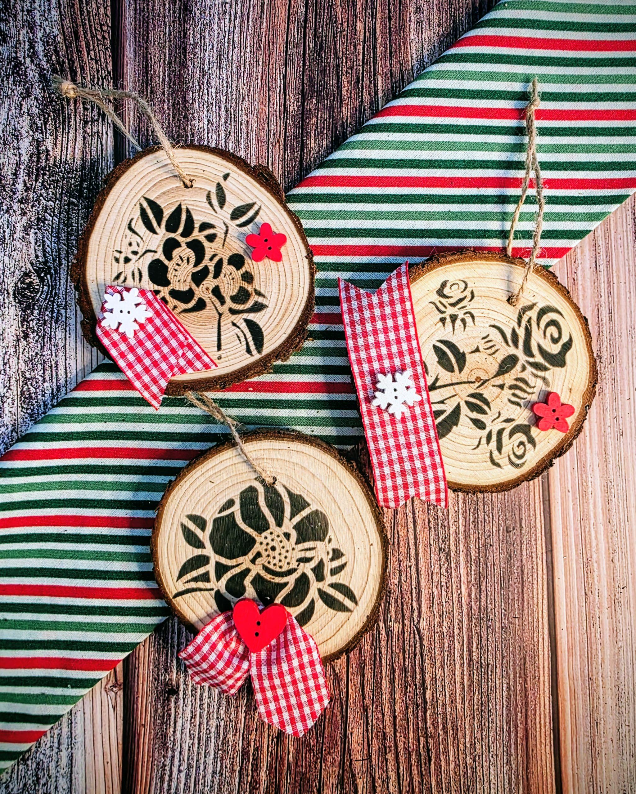 Celebrate the season with Hearth Spot Handmade. Each Artisan Wood Ornament begins with a natural wood slice, stenciled by hand with a Depression-era inspired folk floral pattern. Finished with red gingham ribbon and button details, these ornaments carry a 1930s make-do-and-mend spirit—turning simple scraps into something beautiful.